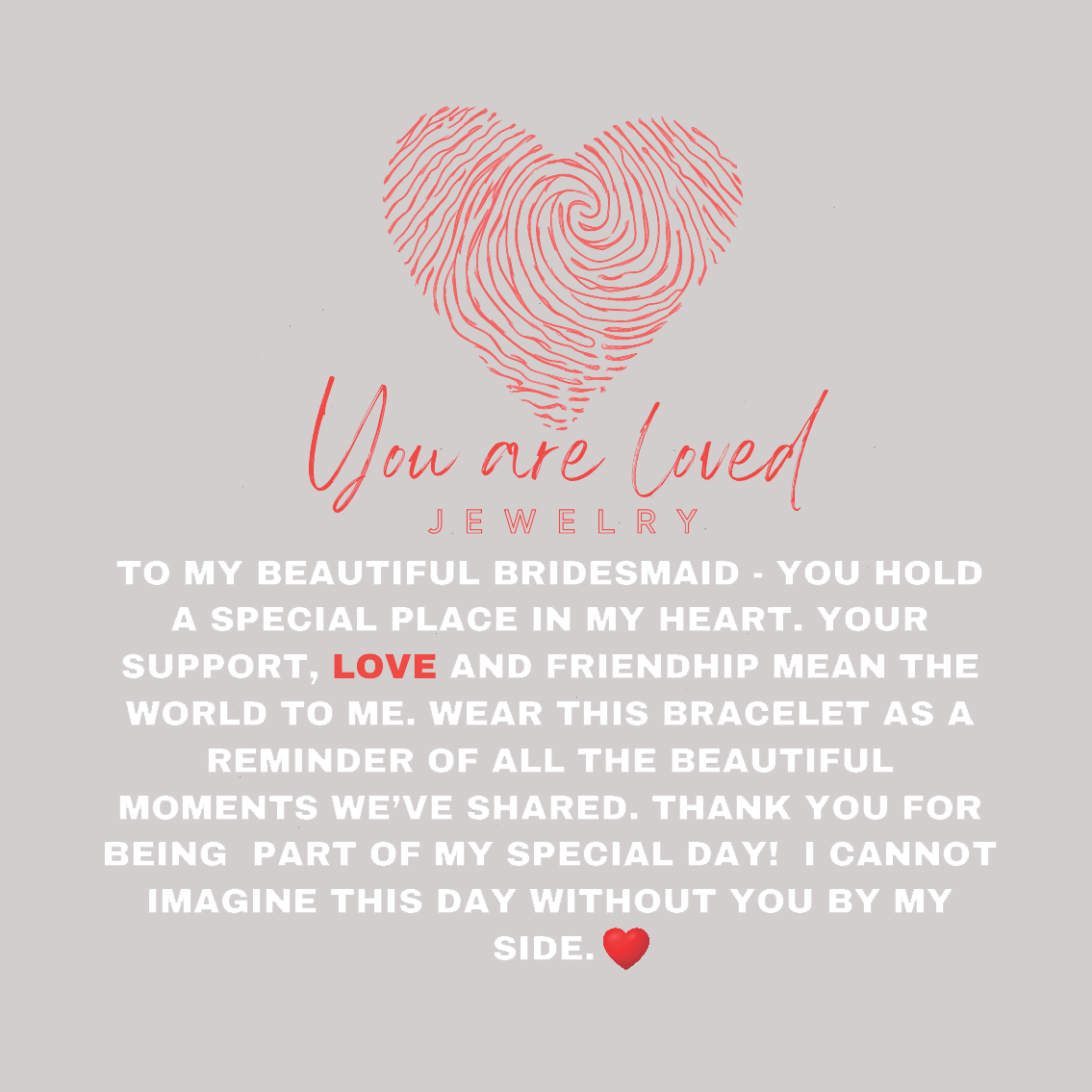 At You Are Loved Jewelry, we specialize in meaningful, ready-to-gift jewelry that makes the perfect keepsake for your bridesmaids, bride, mother of the bride, maid of honor, sister of the bride—you name it. Whether you're celebrating love, friendship, or family, our sentimental gifts speak straight from the heart.